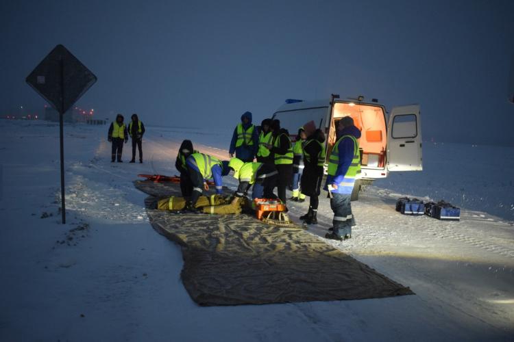 По легенде, во время захода на посадку у самолета не выпустились шасси, он выкатился за пределы взлетно-посадочной полосы, произошло возгорание. На борту находилось 45 пассажиров и три члена экипажа.