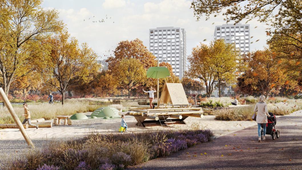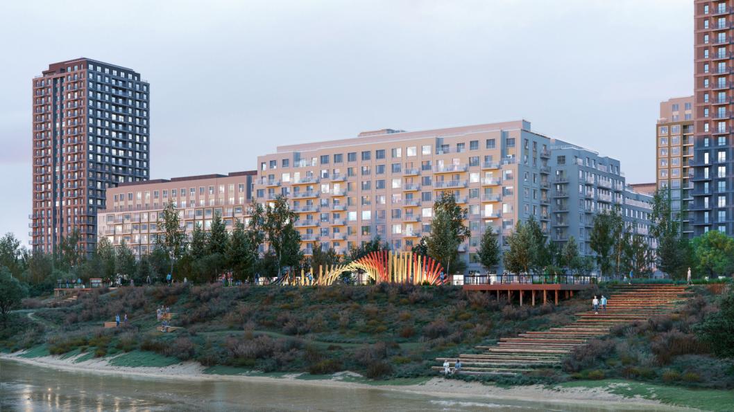 Вдоль променада расположатся функциональные зоны — отдыха, для выгула собак, игровая с интерактивным арт-объектом в виде плота. Это отсылка к истории района, когда по реке сплавляли брёвна, напоминавшие плоты.