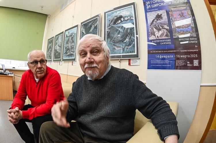 Выставку "За горами, за лесами, за широкими морями" художников Вячеслава Люй-ко из Алматы, Казахстан и Андрея Вахрушева из Салехарда, Ямал, открыли в Арт-салоне "На Никольской" в Тюмени 14 февраля. Она посвящена автору сказки в стихах "Конёк-горбунок" Петру Ершову, которому 6 марта 2025 г. исполняется 210 лет со дня рождения.