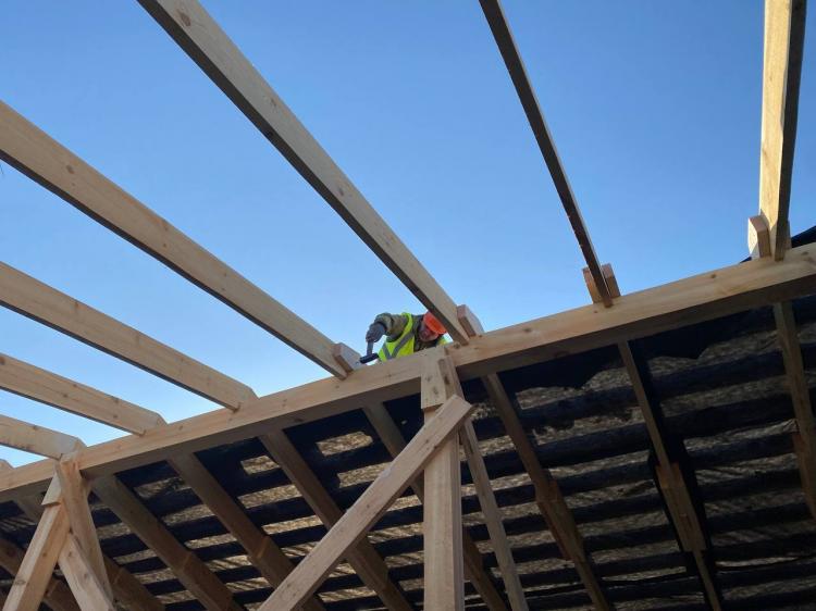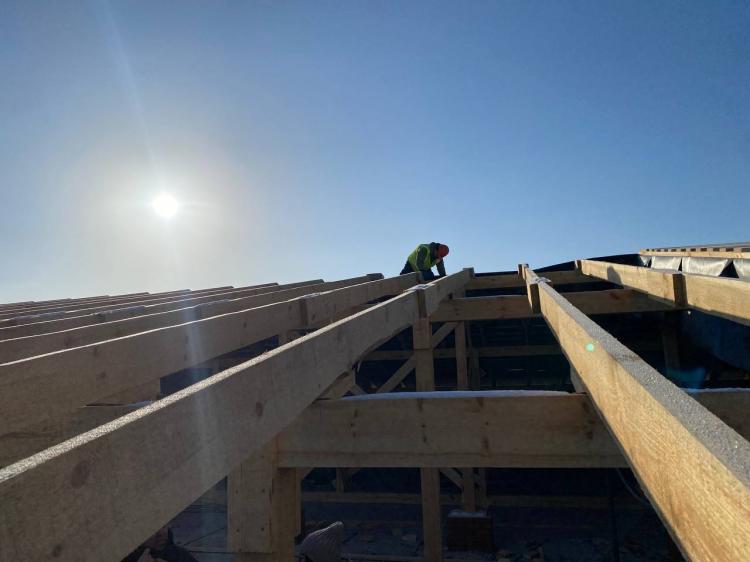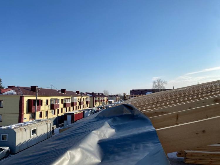 Представитель ООО "Успех" Дмитрий Харланович сообщил, что рабочие на кровле ведут монтаж стропильной конструкции, параллельно затягивают изоспаном пароизоляцию под обрешётку.