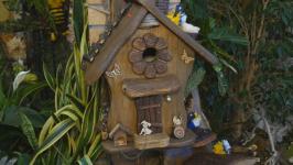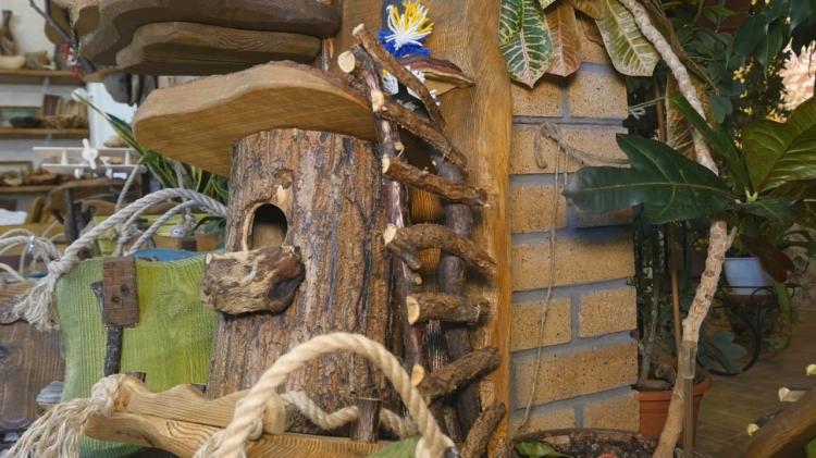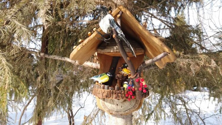 Порой Владимир Сорокин делает очень необычные домики. Например, у него есть трехуровневая кормушка из трех срезов стволов, двух сортов разной древесины. Внизу, как говорит мастер, пещера Али-Бабы. Второй ярус представляет из себя простенькую столовую. Наверху уже кафе, где размещены три стульчика, столик, лавочка.
