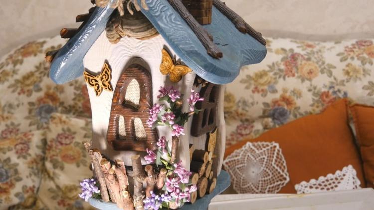 На создание одного домика, пусть и небольших размеров, уходит неделя. Трафареты в своей работе мастер не использует, все делает вручную. Единственное, нужно соблюсти условие, чтобы части крыши плотно прилегали друг к другу, фасад и задняя сторона должны совпадать. Везде присутствует брашировка — это искусственное состаривание дерева с помощью чашкообразной металлической щетки.