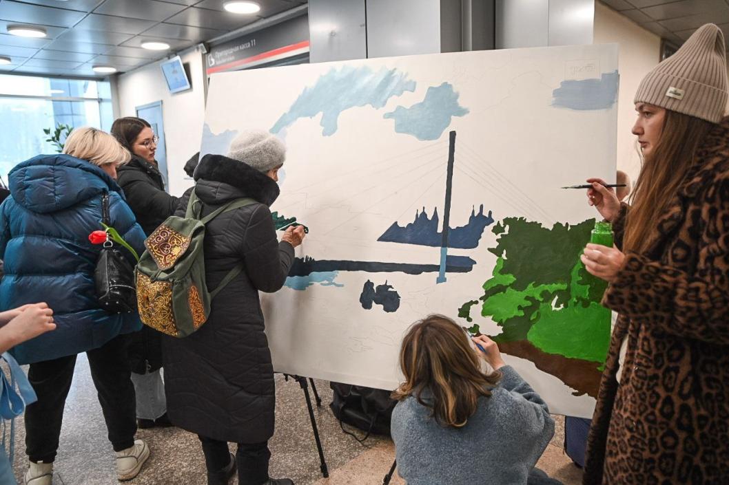 Пока творцы создавали картину, мужчины дарили дамам тюльпаны и шоколад, поздравляли с наступающим женским днем. Для всех присутствующих играл музыкальный коллектив и исполнял популярные песни. Пассажиры не только подпевали, но и танцевали.