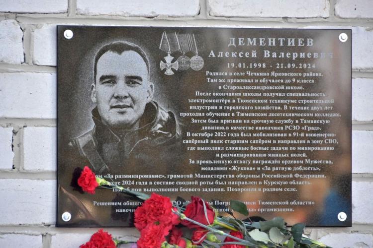 Мемориальную доску в память о бойце СВО Алексее Дементиеве установили на фасаде Староалександровской школы в Ярковском районе. Рядовой Вооруженных сил РФ погиб в зоне проведения специальной военной операции, награжден Орденом Мужества посмертно.