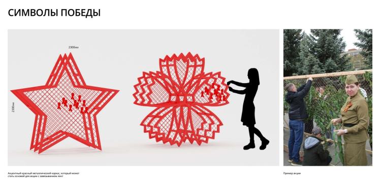 Новшество этого года - металлические каркасные фигуры звезд и гвоздик. Предполагается, что их можно будет использовать для завязывания памятных лент по образцу маскировочных сетей.