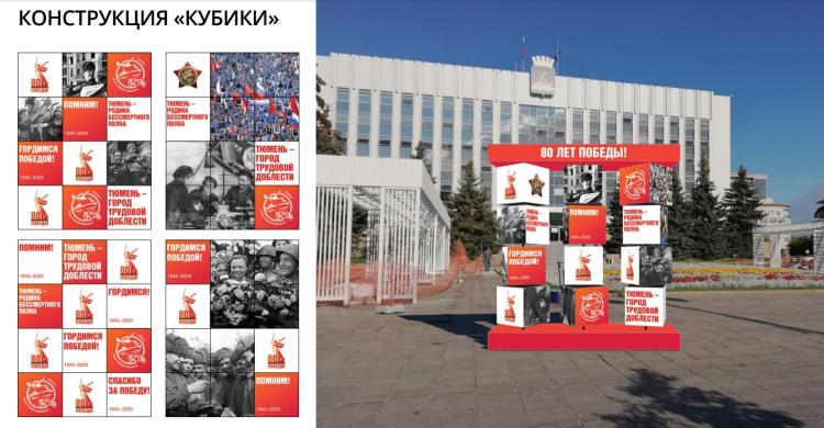 Конструкция "Кубики" традиционно предполагает элементы, которые можно вращать. На них будут нанесены архивные фотографии и слоганы: "Гордимся победой!", "Тюмень — родина "Бессмертного полка" и "Тюмень — город трудовой доблести".