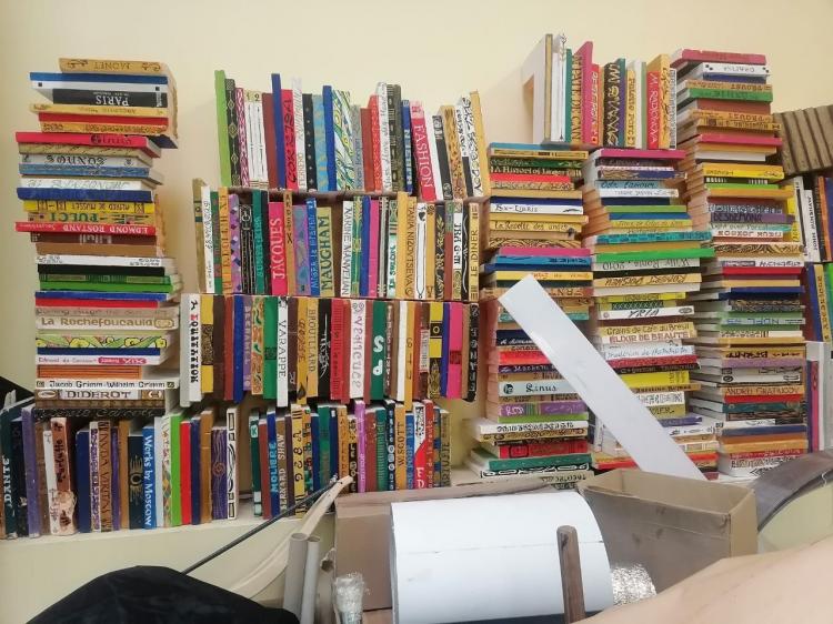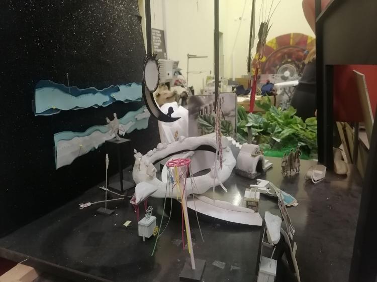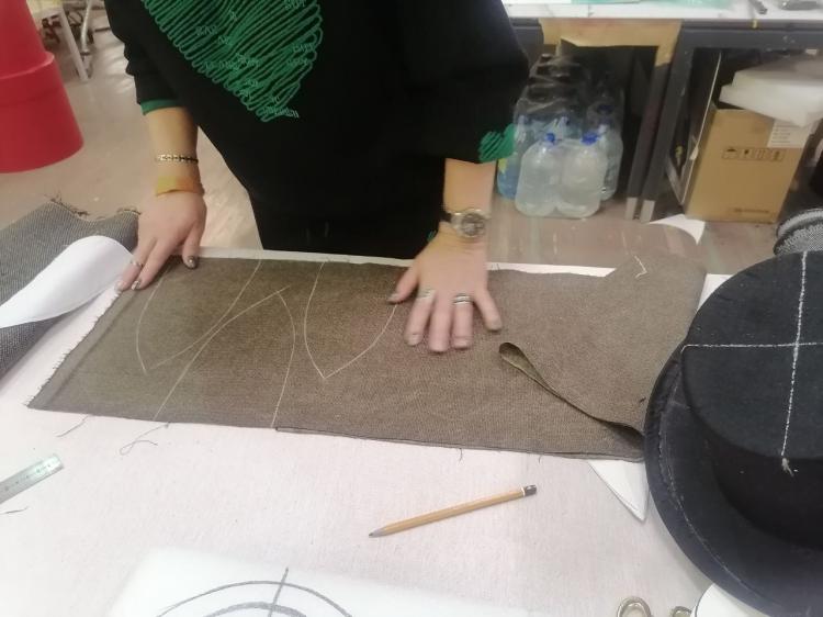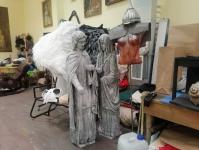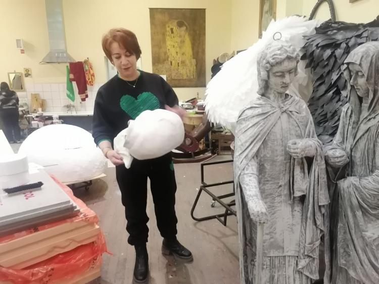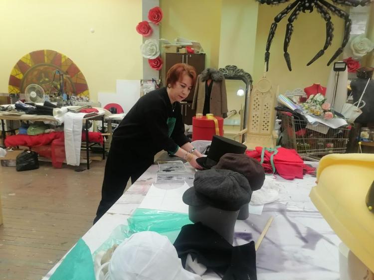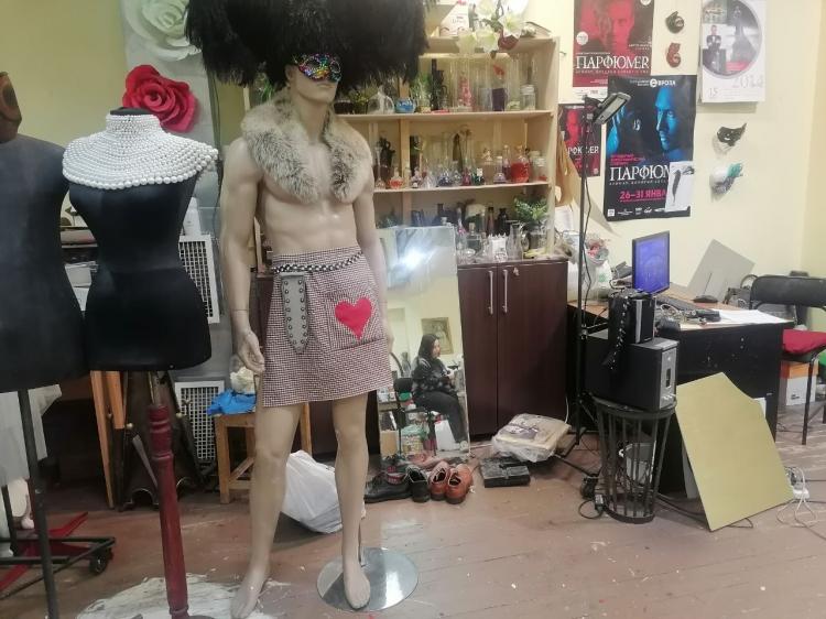 Для тех, кто не был за кулисами драматического театра, в частности в цехе, где создают сценическое пространство, небольшая зарисовка. Найти цех можно по специфическому запаху – что-то среднее между спиртом, клеем и ацетоном. Это огромное, абсолютно сюрреалистичное пространство. Первым в глаза бросается гигантский черный паук из спектакля про Буратино, висящий под потолком. Повсюду стоят статуи, крылья, шлемы, черепа, по стенам развешаны картины и рамки, виднеются манекены, птицы, внушительная библиотека из, как выяснилось в ходе беседы, бутафорских книг. На стойке висят головные уборы всех времен и фасонов, перья, замысловатые маски. В шкафу стоят несколько рядов емкостей различных конфигураций. Имеется ванна, над которой расположена вытяжка, раздается стрекот швейной машинки, негромко переговариваются мастерицы, увлеченные работой. Видно, что пришедшие журналисты вмешались в сложившийся годами ежедневный творческий процесс.