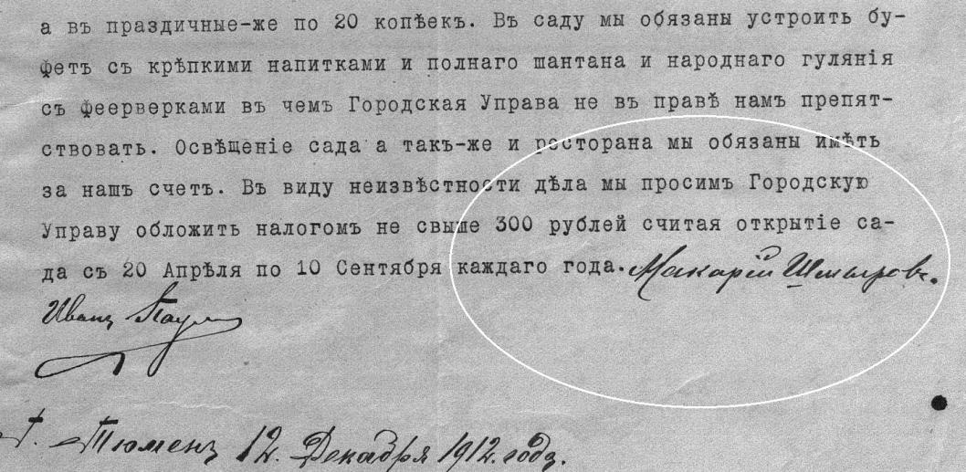 | Фото: Личная подпись Макария Шмырова в переписке с городской управой об аренде Загородного сада, 1913 год