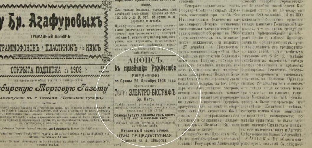 | Фото: Объявление в "Сибирской торговой газете" о показах в доме Шмырова от 30 декабря 1907 года