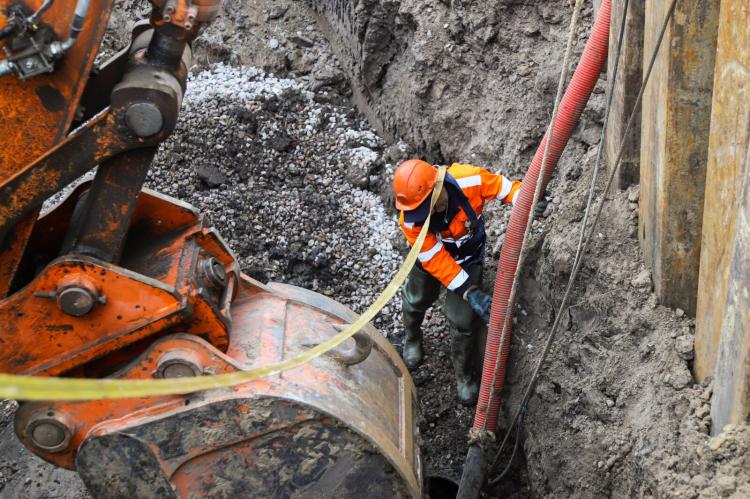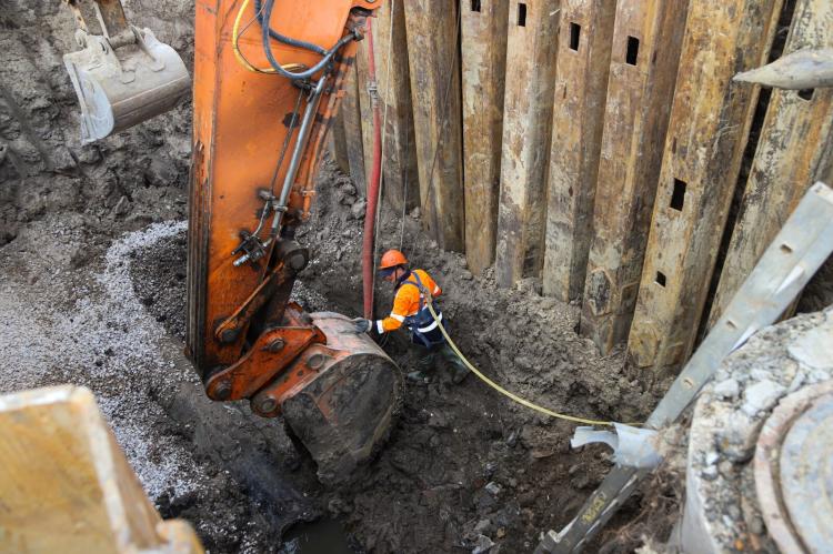 Реконструкцию коллектора проводили открытым способом. Чтобы избежать осыпания грунта при производстве работ, стенки котлована укрепили металлическими шпунтами длиной 9 м.
