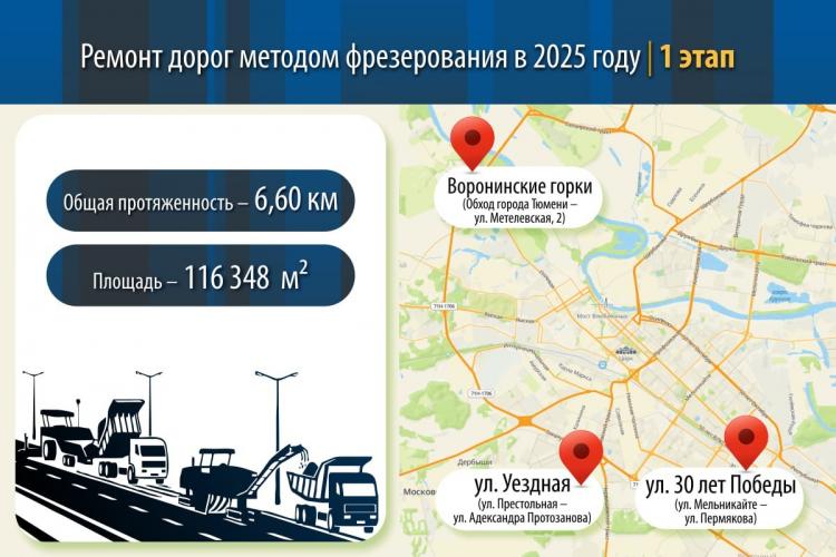 Глава города Максим Афанасьев рассказал, что по нацпроекту в рамках первого этапа подрядная организация приступит к работам на следующих объектах: Воронинские горки (Обход города Тюмени — ул. Метелёвская, 2); ул. 30 лет Победы (ул. Мельникайте — ул. Пермякова); ул. Уездная (ул. Престольная — ул. Александра Протозанова).