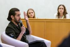 Почётный гражданин Тюмени, автор идеи "Бессмертный полк России" Геннадий Иванов, старшая медсестра перинатального центра, участница СВО Ольга Воронцова и председатель областного Поискового центра Ростислав Ольховский стали гостями встречи "Разговор с героем" в Тюменской городской думе 16 апреля.