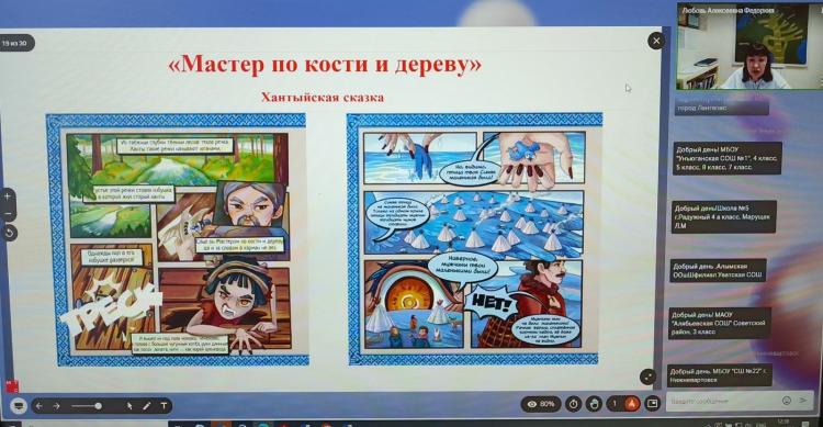 Образовательный онлайн-урок для школьников провела эксперт фольклорного центра Обско-угорского институт прикладных исследований и разработок Любовь Федоркив. Она рассказала про особенности языков и фольклора коренных малочисленных народов Севера, популярных сюжетах и героях на примере сказок из книги "Ожившие легенды Севера", в ребята через комиксы узнали о традициях и культуре своих предков.