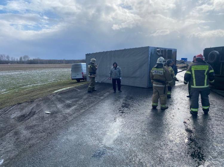 Он двигался со стороны Омска в Тюмень. Водитель не пострадал. На месте аварии работают сотрудники экстренных служб. Организованно реверсивное движение по одной полосе в двух направлениях.