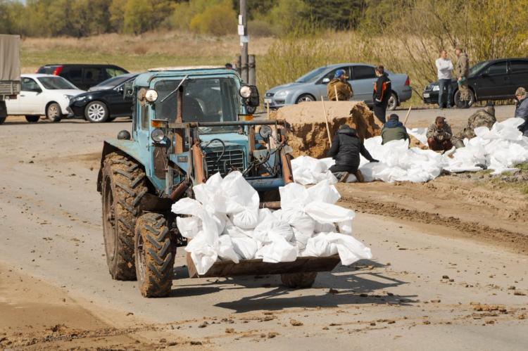 Волонтеры укрепляют откосы пленкой и мешками с песком, чтобы минимизировать угрозу для населенного пункта.