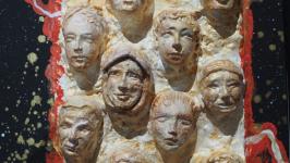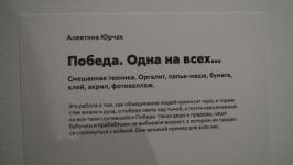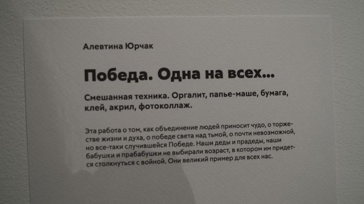 Внимание привлекает работа в смешанной технике "Победа. Одна на всех". Ее автор Алевтина Юрчак рассказала, что она изготовила примерно 465 лиц из папье-маше, ни одно не повторяется. Здесь и мужчины, и женщины, и дети. Работа говорит о том, как объединение людей приносит чудо, о торжестве жизни и духа, о победе света над тьмой.