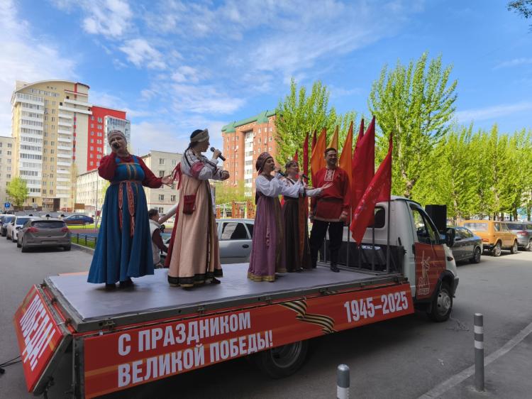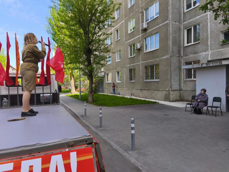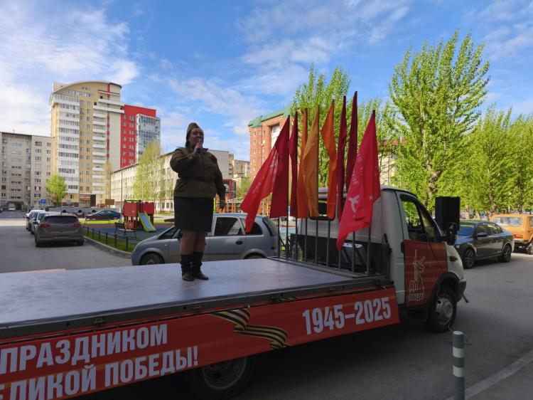 Песни военных лет исполнила фронтовая бригада у дома труженицы тыла Валентины Алексеевны Городничевой на ул. 50 лет Октября в день 80-летия Победы. Для артистов Центра культуры и творчества "Тюмень" двор стал первой точкой из десяти.