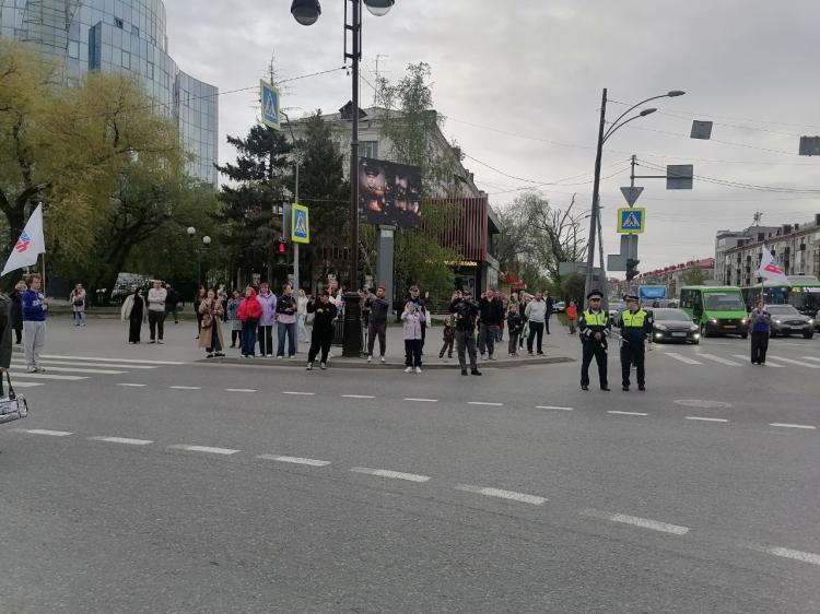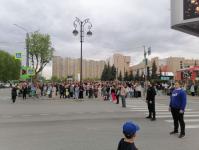 Ровно в 18.55 на перекрестке синхронно замерло движение, стихли разговоры и гул моторов. На цифровых экранах началась трансляция видеоролика с лицами тех, кто ковал победу на фронте и в тылу. Звук шел также из оборудования, размещенного на площади, из динамиков машин тех, кто настроился на волну радио "Диполь-FM". Слова диктора сменил звук метронома и кадры Вечного огня.