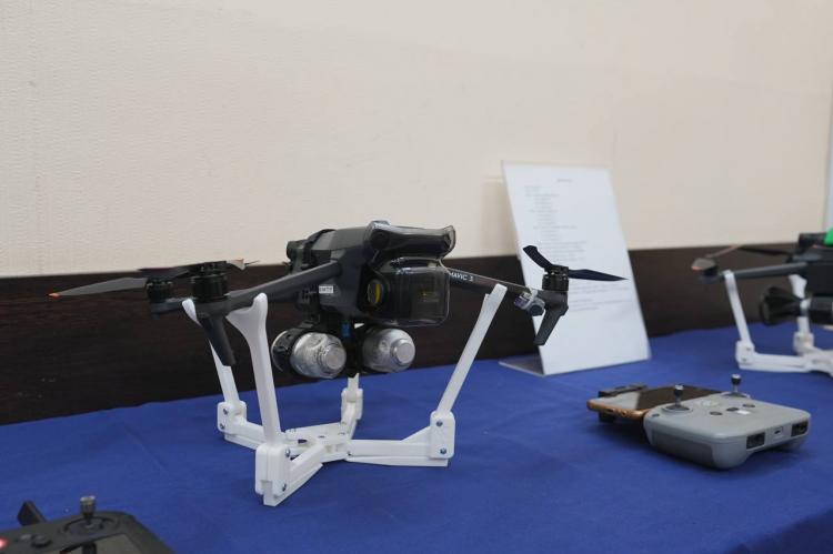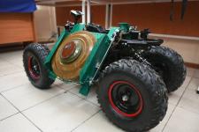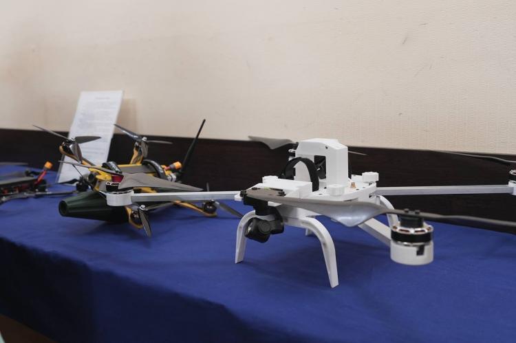 В классе с дронами внимание посетителей привлекла рационализаторская работа курсантов — робот, который сам устанавливает мины. База взята от квадроцикла, две рамы для двух мин. Отметим, ТВВИКУ имеет хороший научный потенциал. Ежегодно курсанты, преподаватели, профессора публикуют научные статьи и создают инновации.