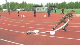 Дружины юных пожарных от 12 до 17 лет спорят за звание лучших на вторых областных соревнованиях на стадионе "Бенат" в Тюмени 20 мая.