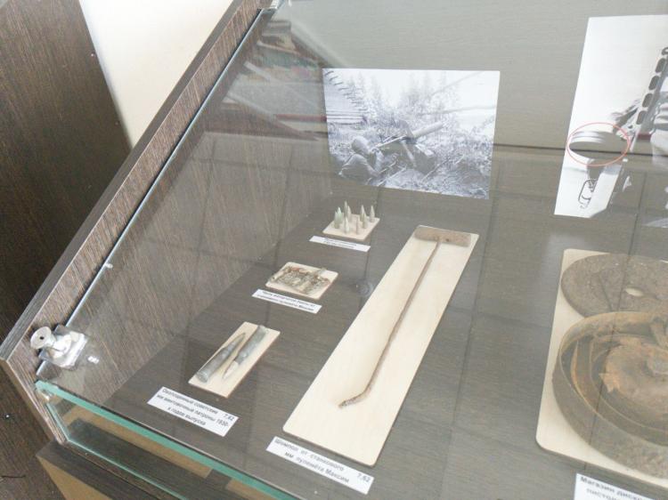 "Это траки от танка "Климент Ворошилов", который в составе одной из танковых бригад поддерживал нашу дивизию в ее контратаках. И как раз на месте этого боя, спустя 80 лет, Кауркины обнаружили два трака, скрепленные между собой специальным "пальцем". Один трак гребневой, а второй – холостой, двухсоставный. Мы его отпескоструили, сварили подставку и выложили на выставке. Посетители могут не только рассмотреть его, но и потрогать", - пояснил руководитель музея.