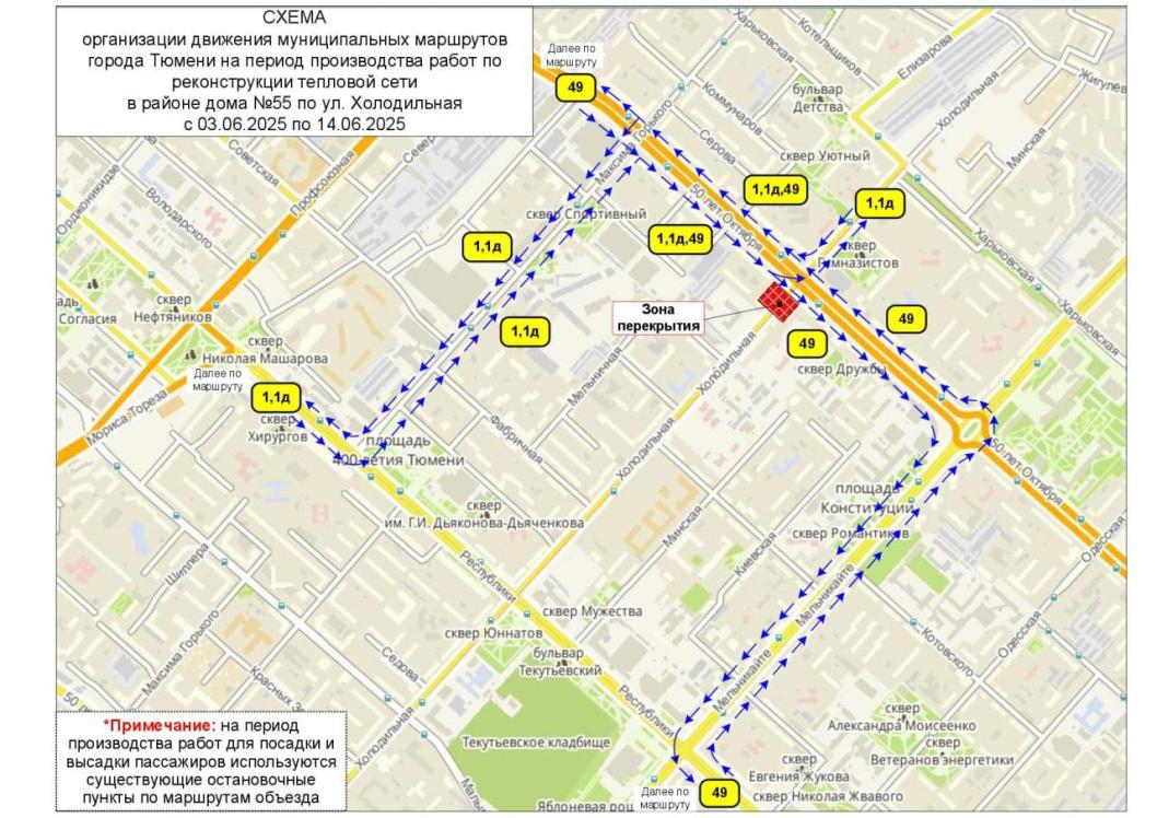 Автобусы 1, 1д, 49 в Тюмени поменяют маршрут из-за перекрытия участка ул. Холодильной