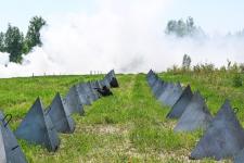 Пирамидальные заграждения ставят вдоль всей линии боевого соприкосновения в несколько рядов. Соединенные между собой металлическими тросами, они зажимают танковую технику противника "в тиски".