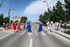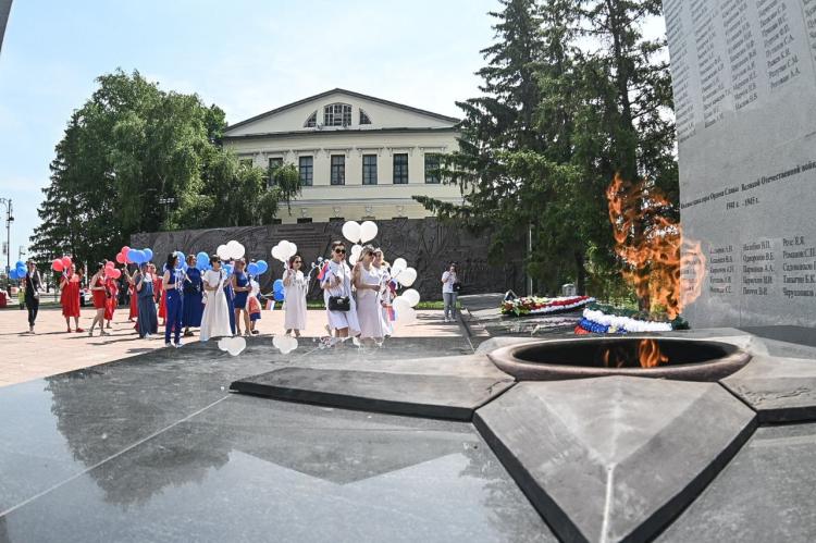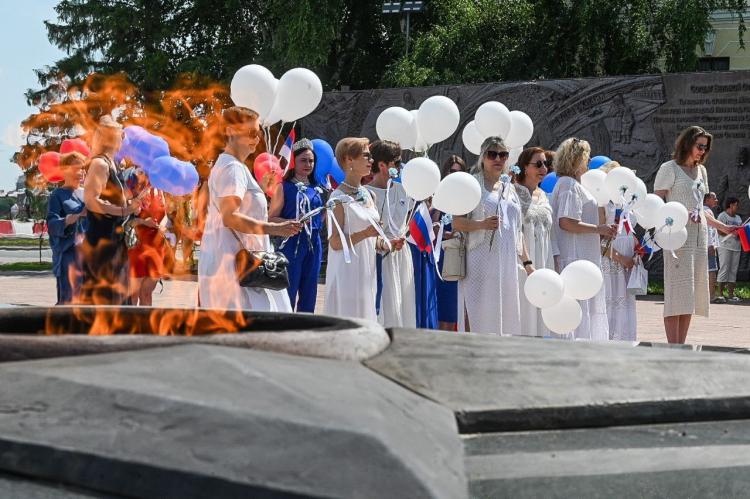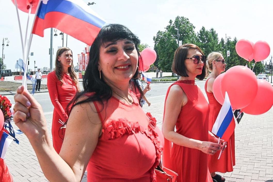 Около 50 участниц в нарядах цветов триколора прошли по главным улицам Тюмени парадом-шествием в честь Дня России 12 июня. Праздник они начали с возложения цветов к мемориалу погибшим воинам Великой Отечественной войны 1941–1945 годов на Исторической площади.