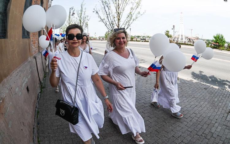 Парад-шествие стал настоящим праздником единения и патриотизма. Участницы, одетые в платья синего, белого и красного цветов создали незабываемое зрелище, которое надолго останется в памяти тюменцев.