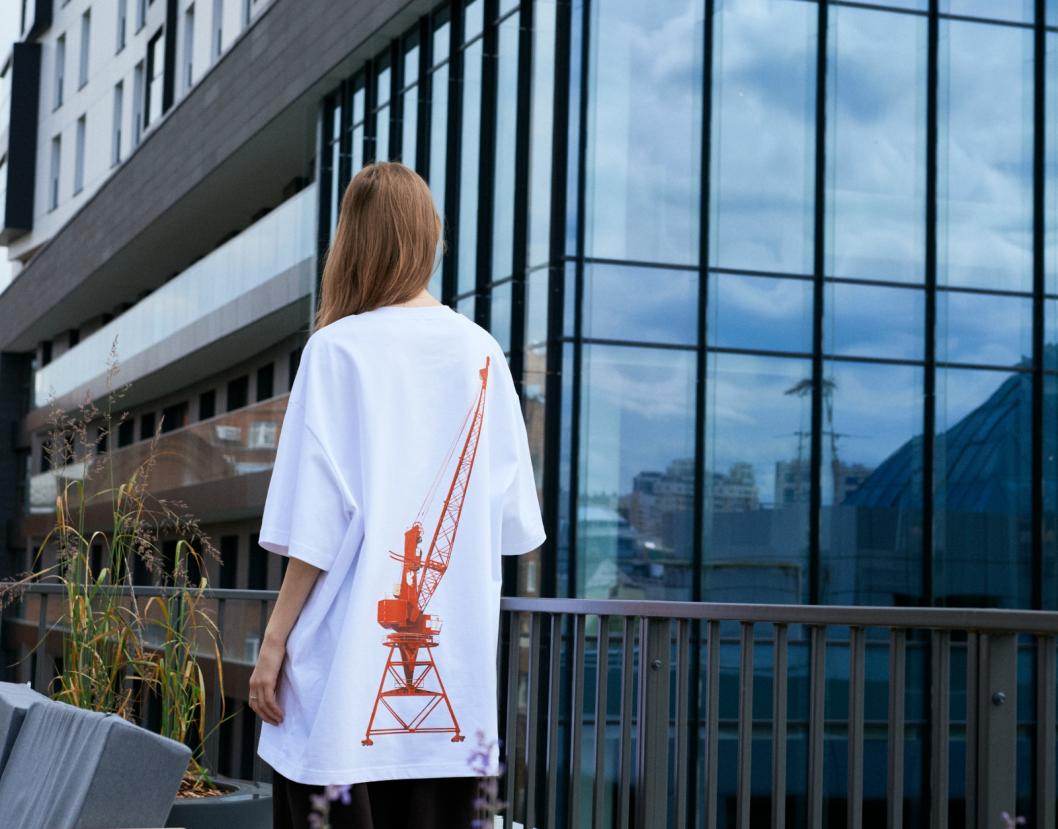 Символ тюменского Речпорта - портальный кран "Ганц" - нанесли на одежду. Такое решение приняли девелоперская компания "Брусника" и уральский бренд одежды TABOO.