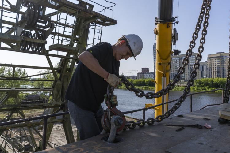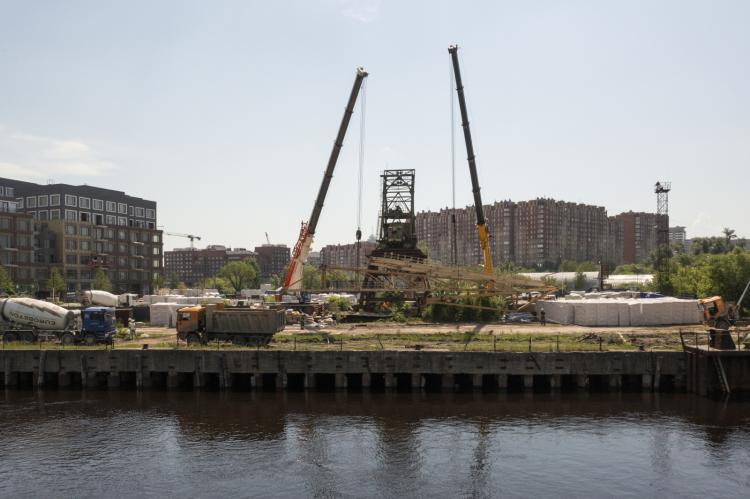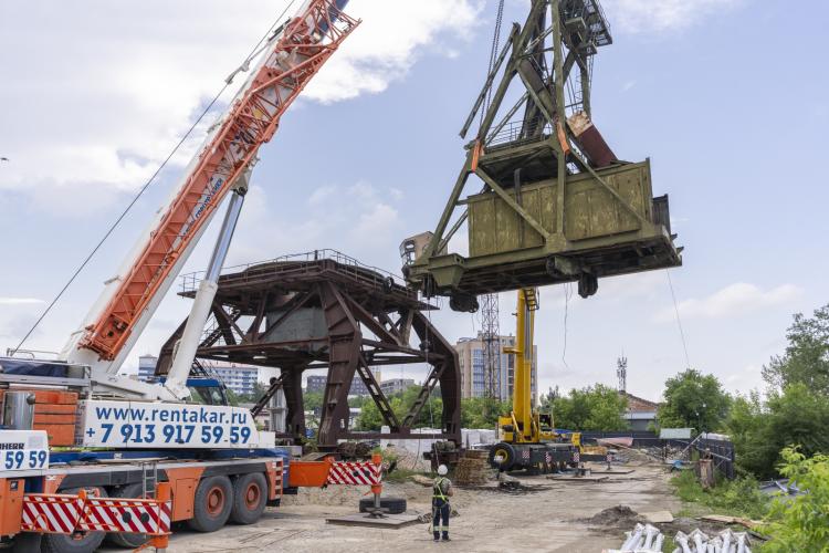 "Для этих целей были вызваны два 200-тонных автокрана из Новосибирска, так как в Тюмени нет техники такого масштаба. Краны прибыли в начале июня, но сразу приступить к работе не смогли - стояли ветреные дни и проводить работы было бы небезопасно. Дождавшись подходящих метеоусловий с Альбрехта сняли стрелу, а оставшийся остов в два этапа переставили на рельсы, расположенные вдоль набережной. Рельсы родные, да не совсем - для того чтобы быть уверенными в надежной установке специалисты сняли участок рельсов, укрепили причальную стенку и залили фундаментную плиту, вроде тех, что кладут в основание многоэтажек. Убедившись, что площадка готова, рельсы вернули на историческое место", - пояснили в "Бруснике".