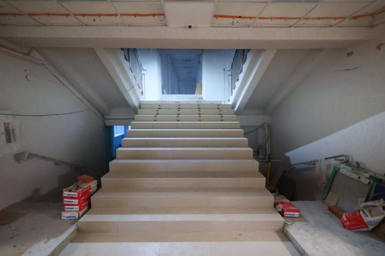 В школе № 2 в микрорайоне Иртышский сделан монтаж монолитной плиты площадки крыльца и лестницы, усилены колонны, демонтирован бордюрный камень. Бригада штукатурит колонны, расчищает площадку под пандус. Работы проведены на 45%.