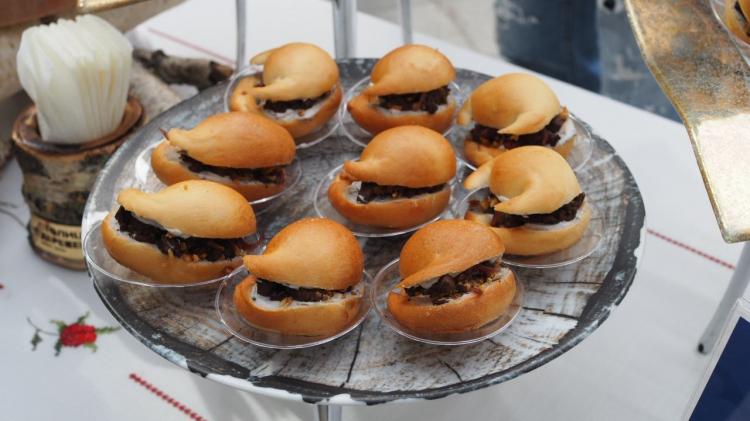 Калач в традиционной форме в виде замка можно было увидеть на столе ресторана "Столица деревень". Начинка — оленина в перечном соусе с луковом конфитюром, использован трюфельный крем. Для текстуры добавлен жареный лук.