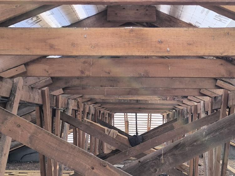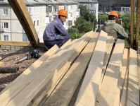 "Выполняем ремонтные работы по замене кровли: частично меняем стропильную систему, шиферную крышу на профнастил. Сначала на обновленные стропила сделают обрешетку, уложат пароизоляционную пленку. Мы стараемся успеть, чтобы не протопить крышу, поэтому работаем захватками", - начальник участка Сергей Воронов.