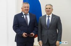 Знак отличия "За заслуги перед Тюменской областью" Александр Моор вручил заместителю председателя комитета Тюменской облдумы по государственному строительству и местному самоуправлению Владимиру Ульянову.