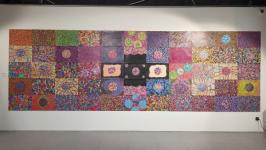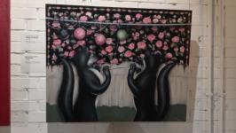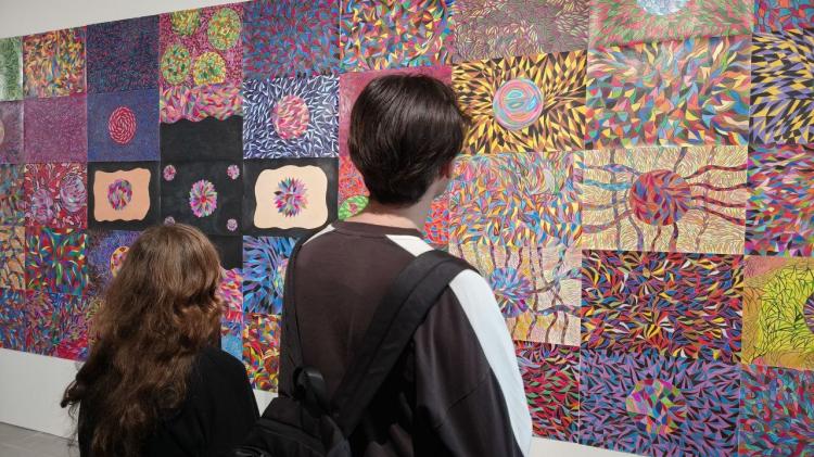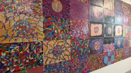 Карандашная работа художника Владимир Патрушев рассказывает о традиционном ремесленническом направлении в Тюмени. Готовясь к выставке, он решил рассмотреть, как бы выглядел тюменский ковер в космосе, бесконечности. Его картина занимает часть стены выставочного пространства. Владимир надеется, что в дальнейшем размер будет только увеличиваться.