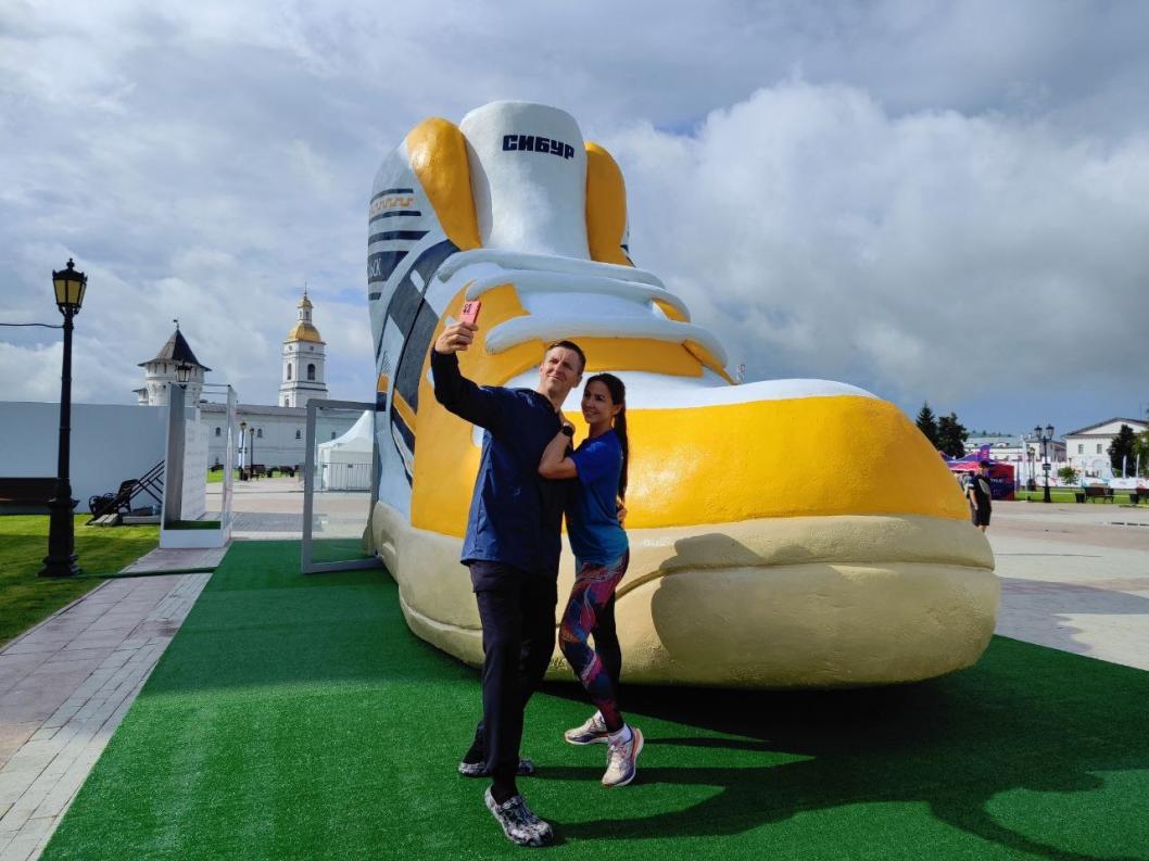 Гигантский кроссовок высотой более пяти метров установили на Красной площади в Тобольске. Здесь идет регистрация на марафон, пишет СИБУР.