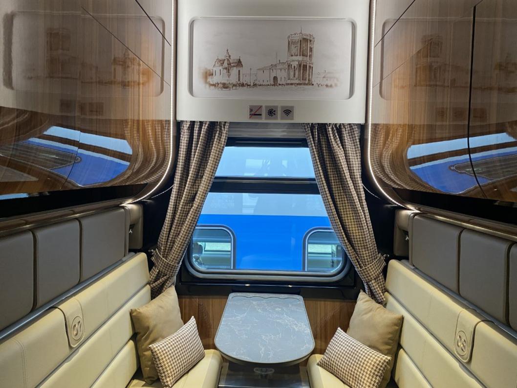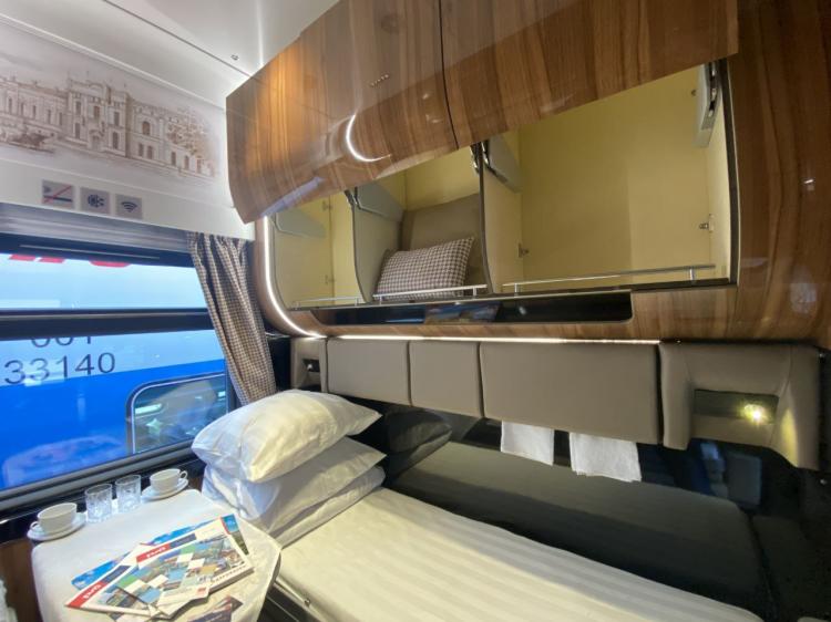 "За счет вместительных закрытых полок над спальными местами появилось больше пространства для хранения ручной клади и спортинвентаря. Для ценных вещей предусмотрен сейф. Есть кнопки вызова проводника и индивидуальные светодиодные светильники, розетки 220 В и USB-разъемы для зарядки мобильных устройств и мультимедийные экраны с возможностью выбора контента", - отмечено в сообщении.