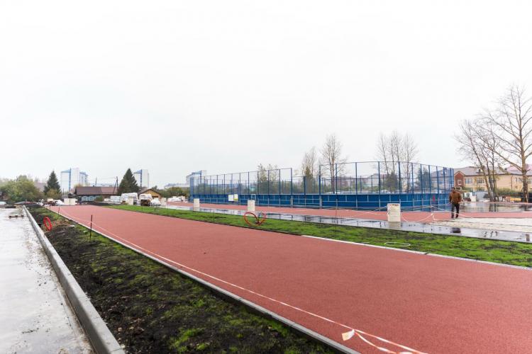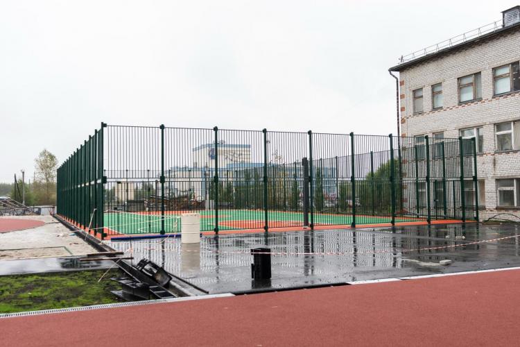 Для будущих учеников строители уже установили волейбольную и баскетбольную площадки, беговую дорожку, яму для прыжков в длину. Подготовлено покрытие для ледового корта. Еще появятся две детские игровые площадки, площадка со сценой, МАФы.