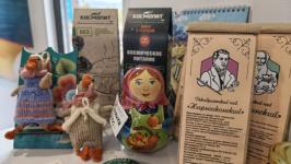 В ТИЦ можно увидеть открытки, магниты на холодильник, подставки под кружки и другие сувениры, а также косметику из санаториев "Озеро Медвежье" и "Сосновая роща".