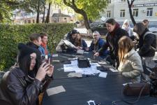 Участники форума "Утро" из тюменской и курганской делегаций, куда входят ребята ЛНР и ДНР, создают мурал "Наши герои вне времени" на стене госархива социально-политической истории Тюменской области. Он посвящен исторической памяти: в его основе — соединение прошлого и настоящего.