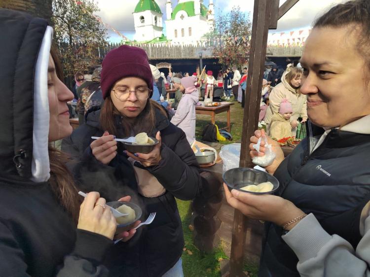 В этом году на территории развернулась творческая сцена, ярмарка, игровая зона. Всем желающим предлагают "Дать по щам" - так называется гастрономическая локация, где гости могут отведать наваристых щей. Рядом умельцы лепят пельмени - и тоже с капустой.