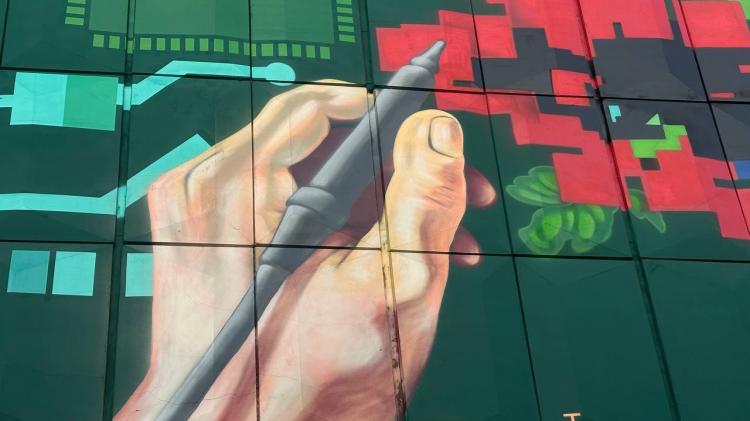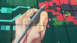 На мурале есть две части: современность с микросхемами и прошлое с тюменским ковром. На нем изображены маки, которые активно цветут в Краснодоне.
