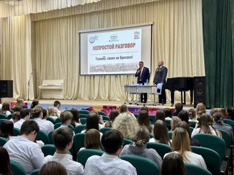 Депутат Тюменской областной думы, наставник проекта "Боевой кадровый резерв Тюменской области" Юрий Баранчук вместе с ветераном СВО, своим подопечным по программе Вадимом Немировым провели встречу с учениками тюменской школы № 89 в формате открытого диалога "Непростой разговор". Темой встречи стала поддержка российских военных и реализация гуманитарной миссии в зоне СВО.