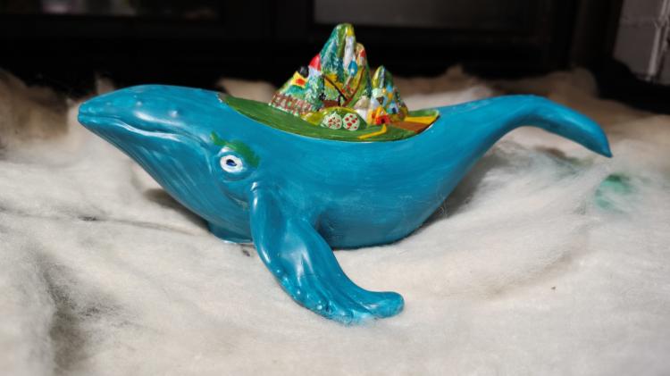Внимание своими размерами привлекает и Жар-птица. Сверху можно увидеть небольшую детскую работу- именно ее показали художникам Александру Лисину и Анне Баяновой и попросили сделать что-то более объемное.