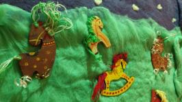 Представлены работы в разных форман. Можно увидеть и графику, и роспись по дереву, и глиняные изделия. Есть большой Конёк-горбунок, “летящий на фоне звёзд”.