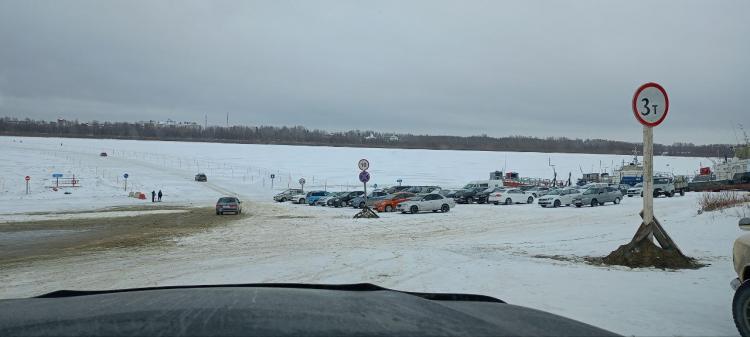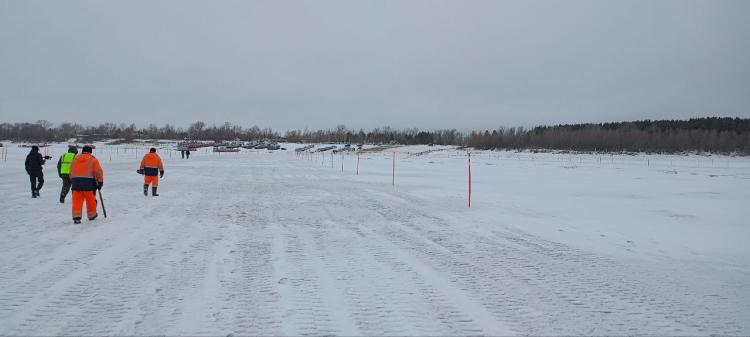 Толщина льда составляет в среднем 40 см. На переправе организованы основная и резервная полосы. Установлены дорожные знаки, направляющие вешки.