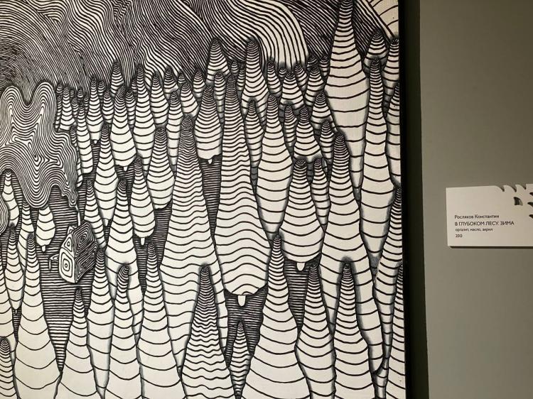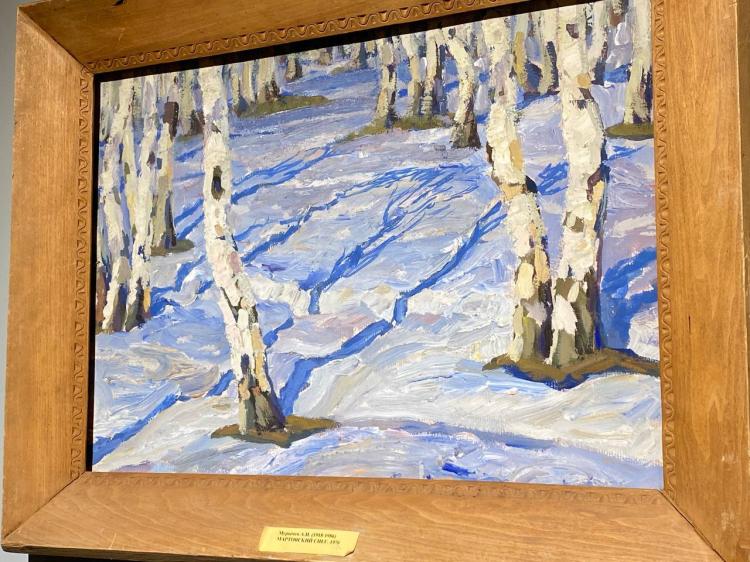 Вниманию зрителей представлены картины разных эпох из фонда музея, в том числе работы Михаила Гардубея "Рождество в Карпатах" 2003 г. и Александра Мурычева "Мартовский снег" 1976 г. С ними по соседству есть "В глубоком лесу. Зима" Константина Рослякова 2013 г.