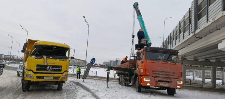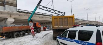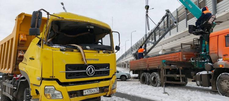 В Тюмени на ул. Пермякова самосвал снес надземную конструкцию