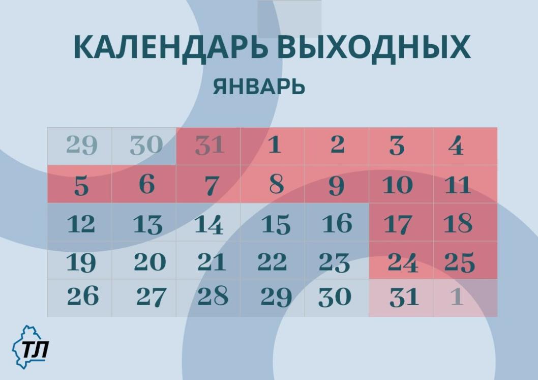 "Отдыхаем с 31 декабря по 11 января включительно. А на работу выходим 12 января, в понедельник. Можно заранее планировать поездки, встречи с близкими и просто хороший отдых", - рассказали в Министерстве труда.